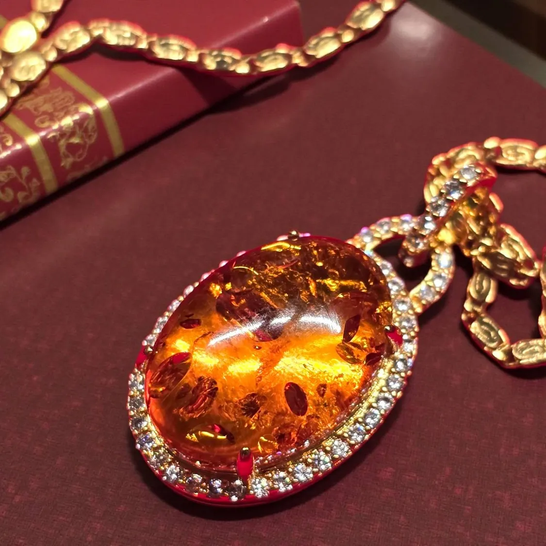 周圍晶鑽排列均勻,讓琥珀光線被完美框起,整體呈現出「珠寶級」的華麗。