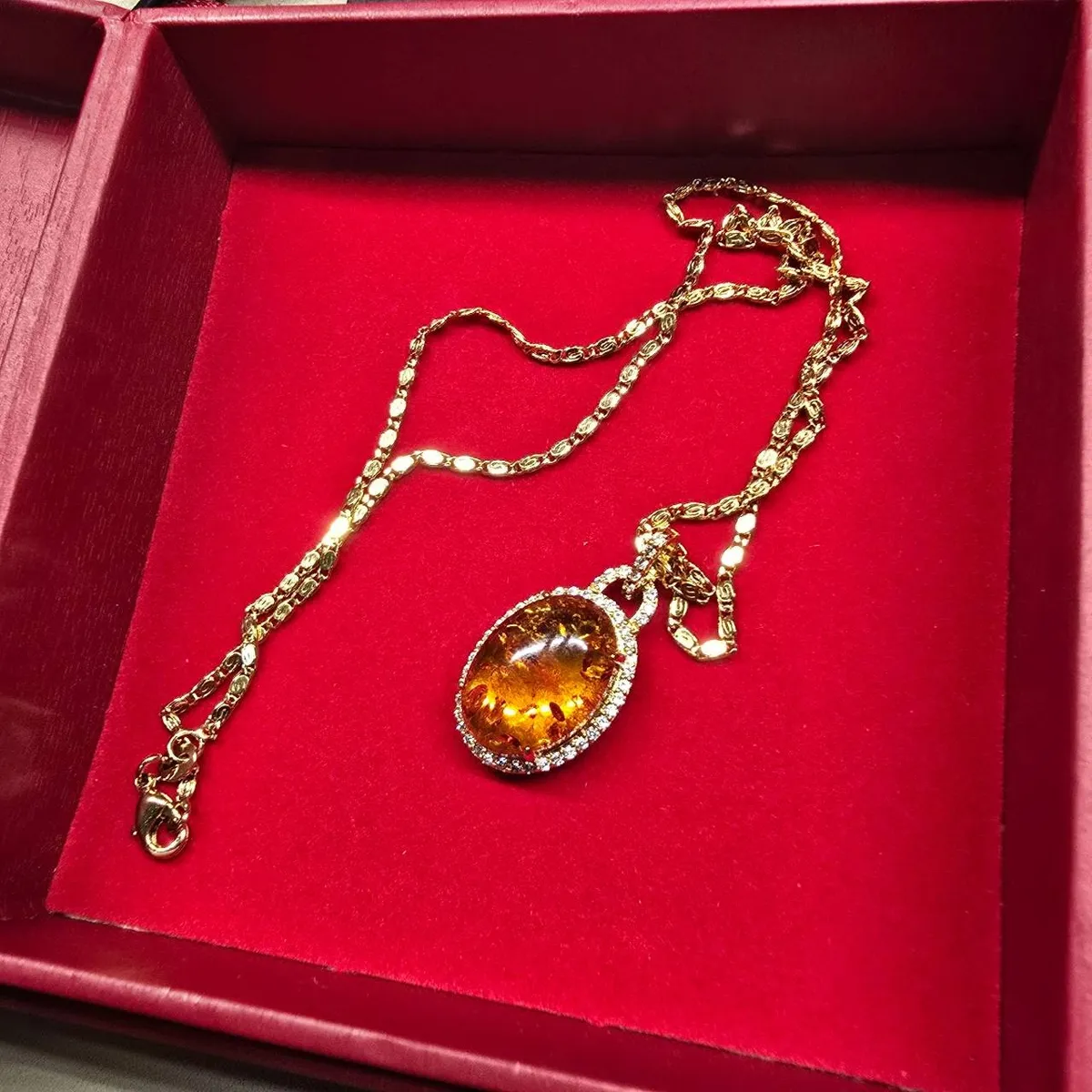 主石乾淨、通透,在燈光下呈現明顯的火光跳動感,是天然琥珀中較難得的精品色階。