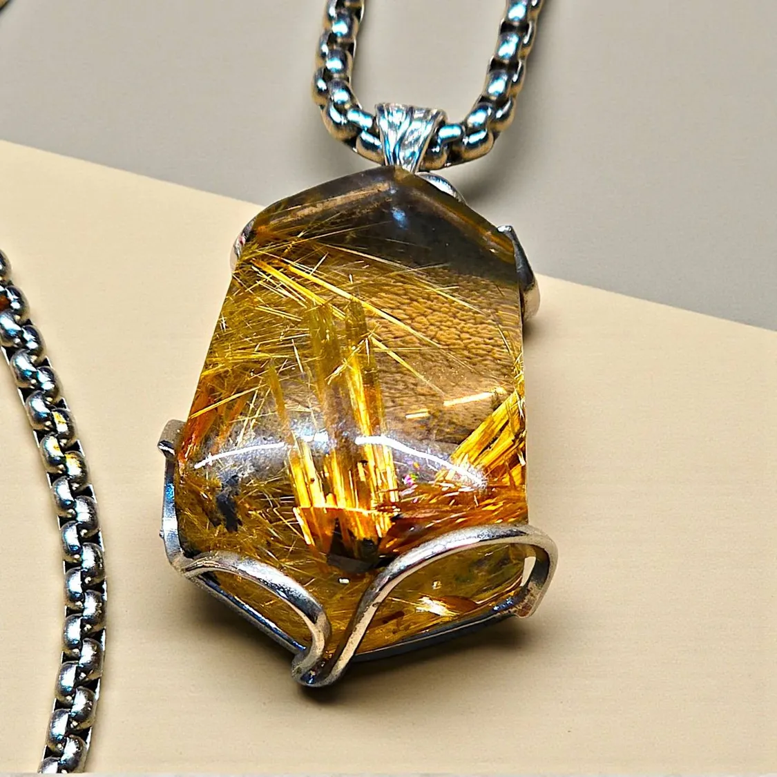 光線照射時,內部金針呈現放射狀爆裂光芒,像是被封存的金色雷束。